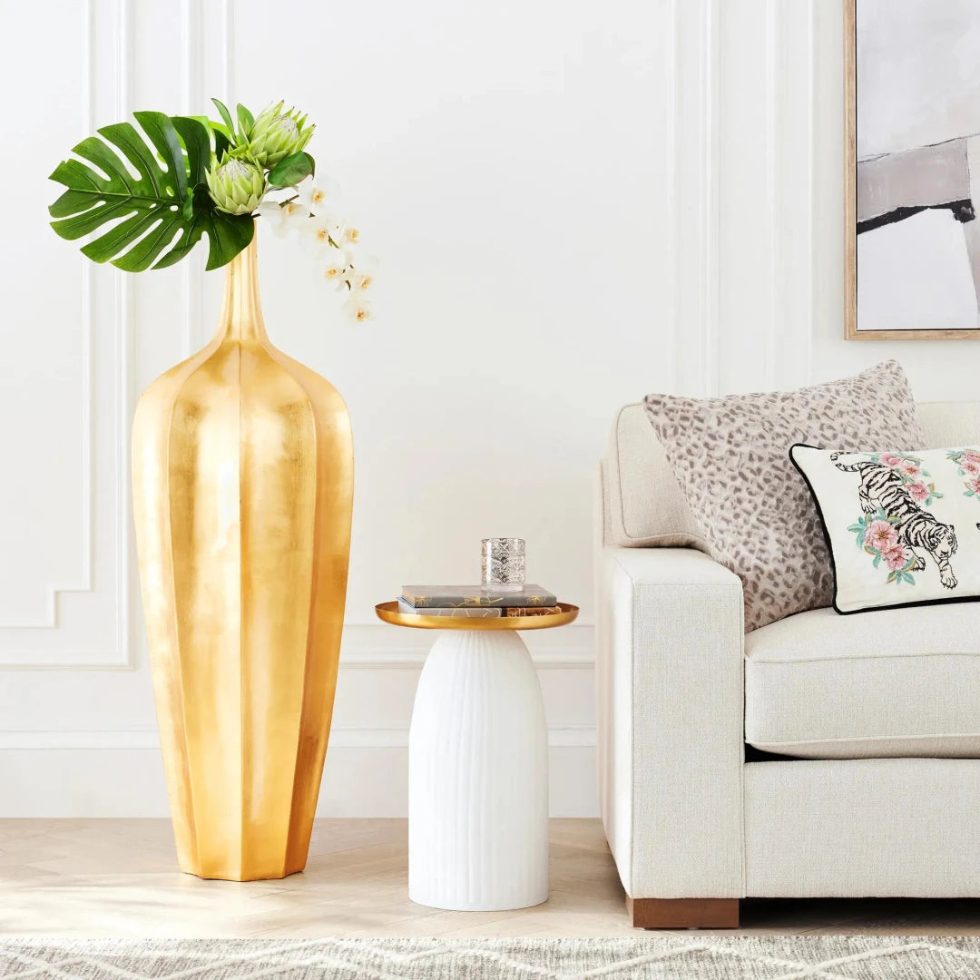 The Accolade Vase features a rich gold foil surface that captures light and adds drama. At over 48.75″ tall, it makes an instant focal point in living rooms, entryways or grand halls.